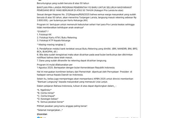 KUTAIPANRITA.ID, JAKARTA – Sebuah unggahan di Facebook menyebutkan bahwa pemerintah memiliki program bantuan baru untuk pra-lansia, yaitu masyarakat berusia di atas 50 tahun.